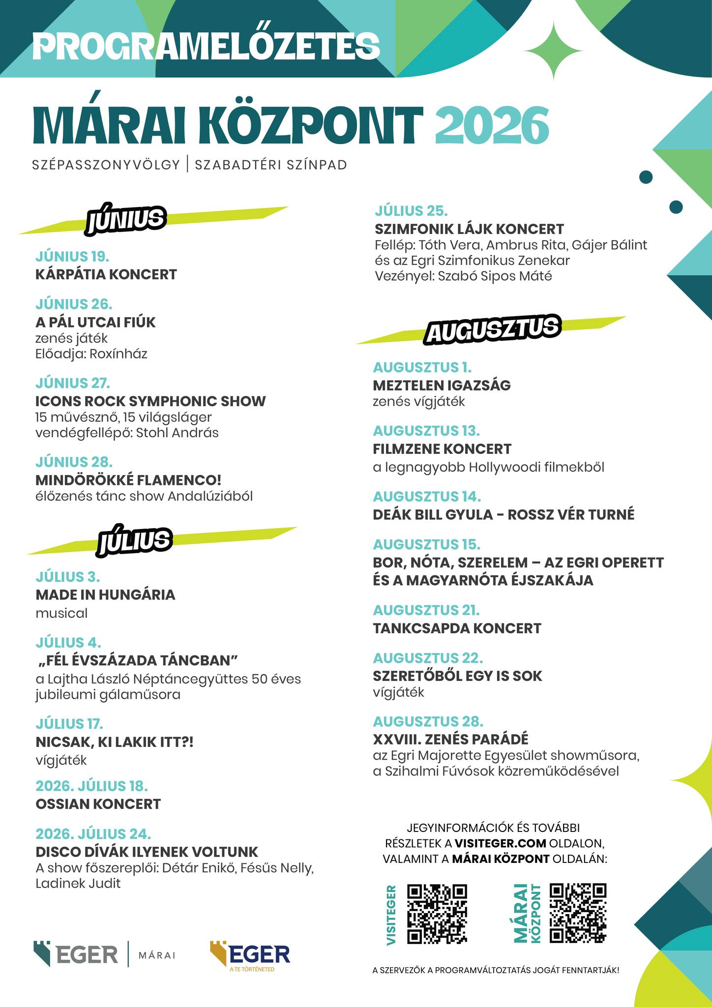 - July 25 | Symphonic Like Concert, featuring Vera Tóth, Rita Ambrus, Bálint Gájer, and the Eger Symphony Orchestra, conducted by Máté Szabó Sipos