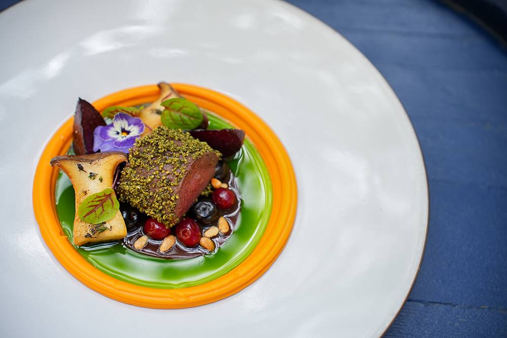 • Venison loin with sweet potato, cranberry, and king oyster mushroom