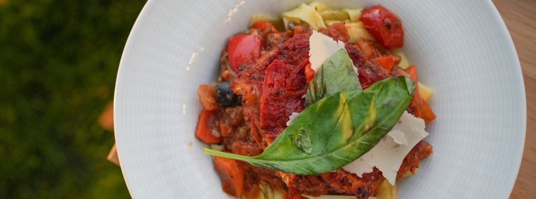 - Tejszínes – spárgás tagliatelle, pesto - s, grillezett csirkemell, olivás zöld