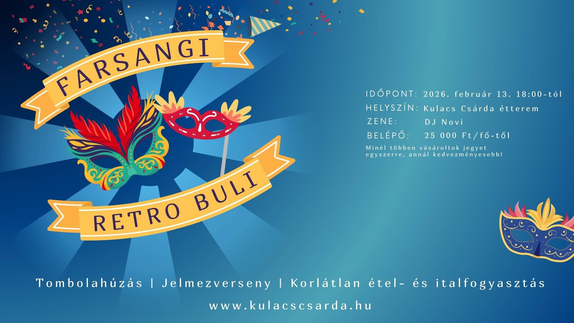 Húzd elő a legjobb jelmezed, és csatlakozz hozzánk egy igazi farsangi, retró hangulatú bulira, ahol a jókedv, a finom falatok és a hajnalig tartó tánc garantált!