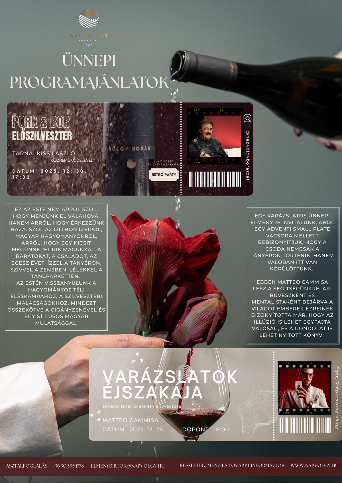 - Az ehhez kapcsolódó információkért, illetve asztalfoglalásért keress minket az alábbi elérhetőségeken a 06 30 595 1778 telefonszámon, vagy pedig e-mailben az elmenybirtok@napvolgy.hu címen.