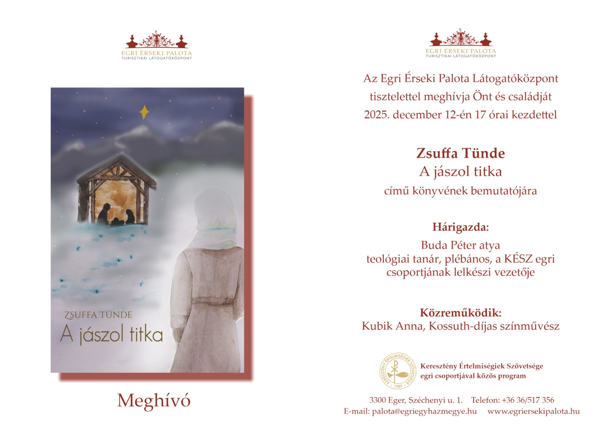 Az Egri Érseki Palota Látogatóközpont tisztelettel meghívja Önt és családját 2025. december 12-én 17 órai kezdettel Zsuffa Tünde, A jászol titka című könyvének bemutatójára.