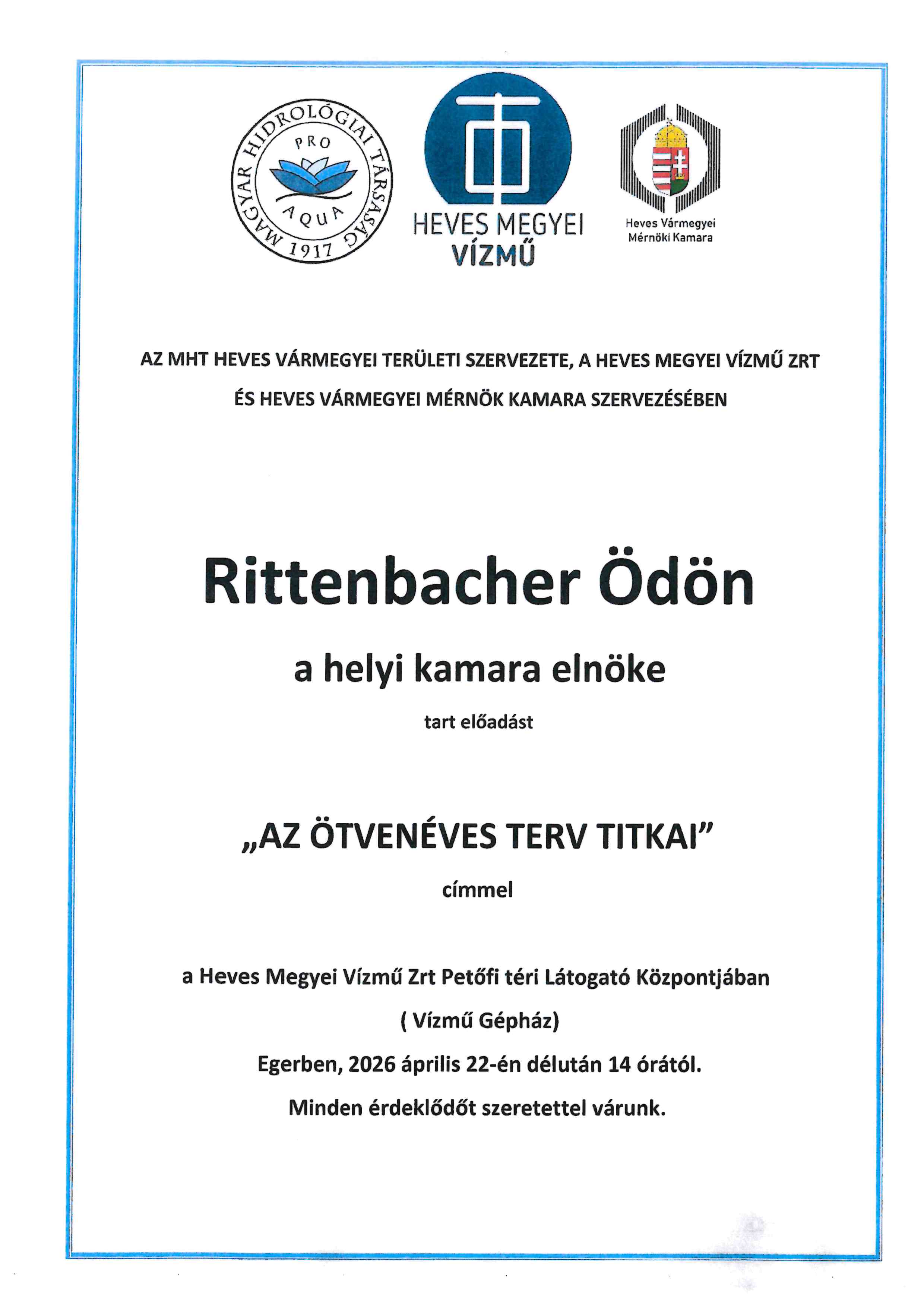 Szervező: Heves Megyei Vízmű Zrt., a Magyar Hidrológiai Társaság Heves Vármegyei Területi Szervezete és a Heves Vármegyei Mérnöki Kamara