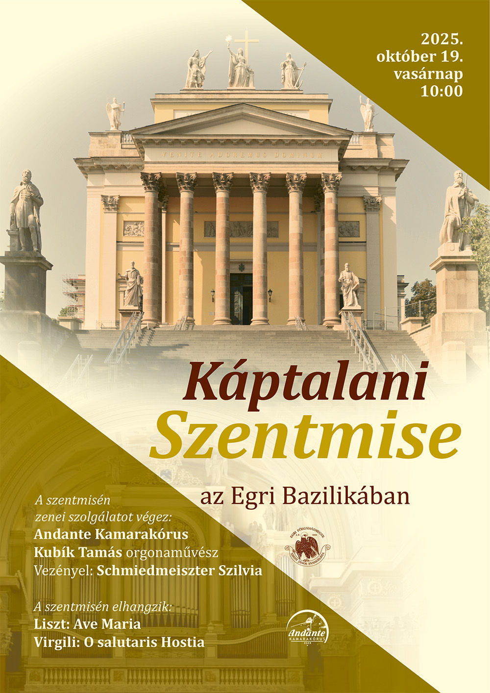 A szentmisén zenei szolgálatot végez: Andante Kamarakórus Kubík Tamás orgonaművész Vezényel: Schmiedmeiszter Szilvia A szentmisén elhangzik: Liszt: Ave Maria Virgili: O salutaris Hostia A változás joga fenntartva.