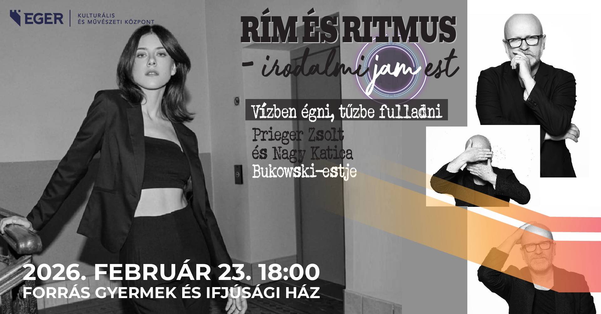 A Rím és Ritmus irodalmi jam est első estjén, Charles Bukowski világa robban be a Forrásba: "Vízben égni, Tűzbe fulladni." Nagy Katica (Semmelweis című film női főszereplője) és Prieger Zsolt (Anima Sound System) elementáris előadásában...