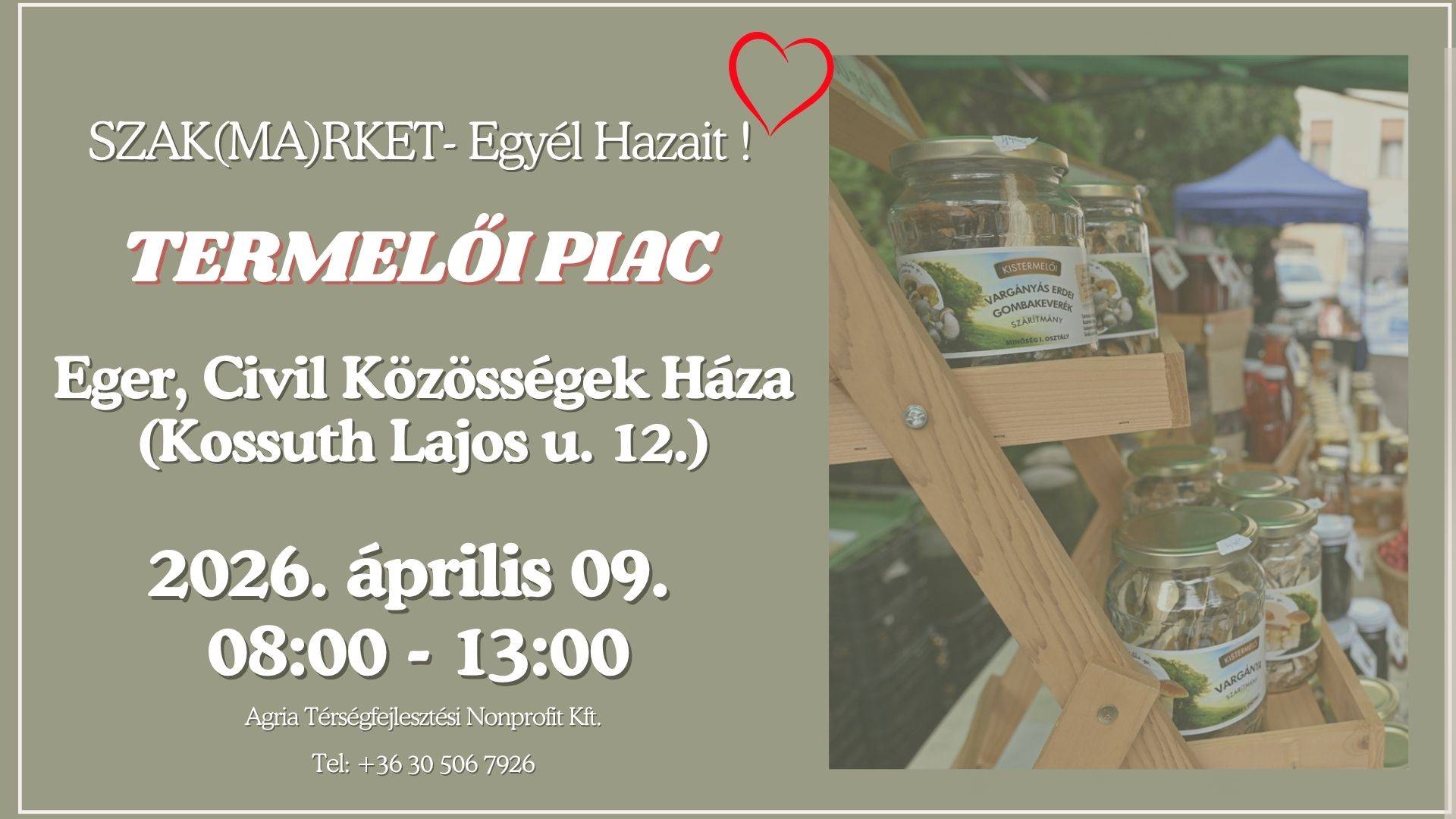 Április 9-én (csütörtökön) 08:00 - 13.00 között újra találkozhatunk a Szak(ma)rket – termelői piacon Egerben, a Civil Közösségek Háza udvarán!