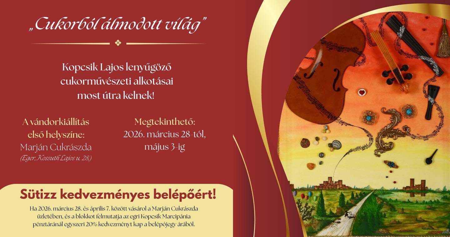 A kiállítás ízelítőt ad a Kopcsik Marcipánia különleges gyűjteményéből, ahol több mint száz marcipánalkotás várja a látogatókat Eger történelmi belvárosában.