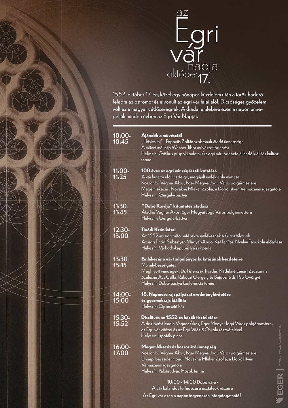 Köszöntő: Vágner Ákos, Eger Megyei Jogú Város polgármestere. Ünnepi beszédet mond: Novákné Mlakár Zsófia, a Dobó István Vármúzeum igazgatója. Helyszín: Palotaudvar, Hősök terme. -