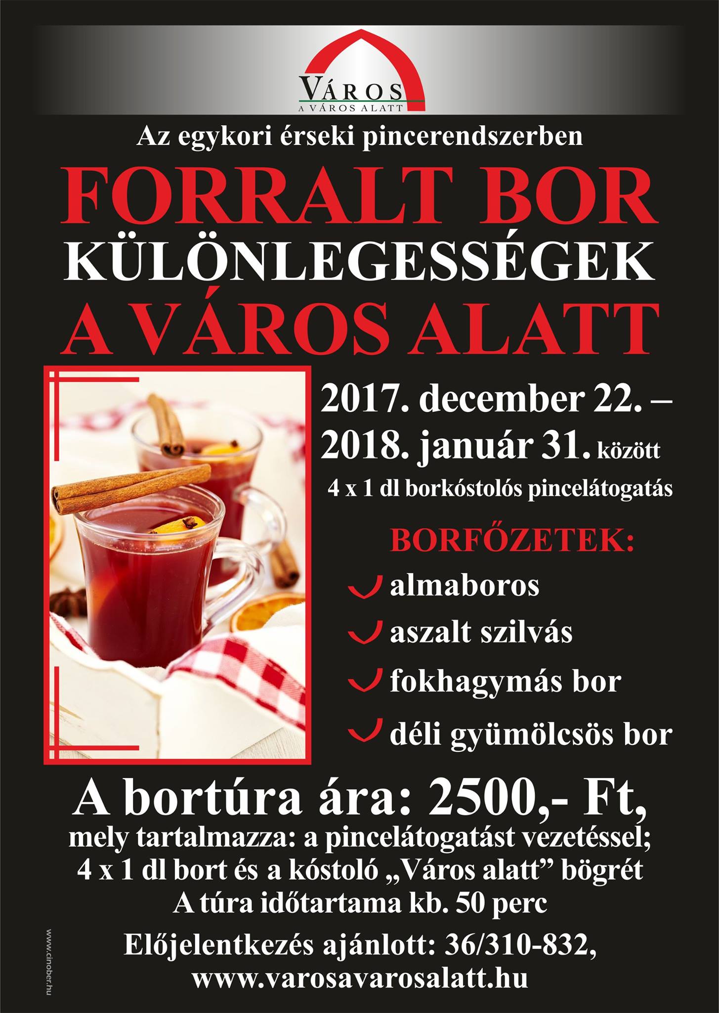 A téli időszakban négy fajta forralt bor különlegességgel várjuk Vendégeinket vezetett pincesétáinkon. A borokat a Város A Város Alatt cserépbögréjéből kóstolhatják, amit a séta végén megtarthatnak.
