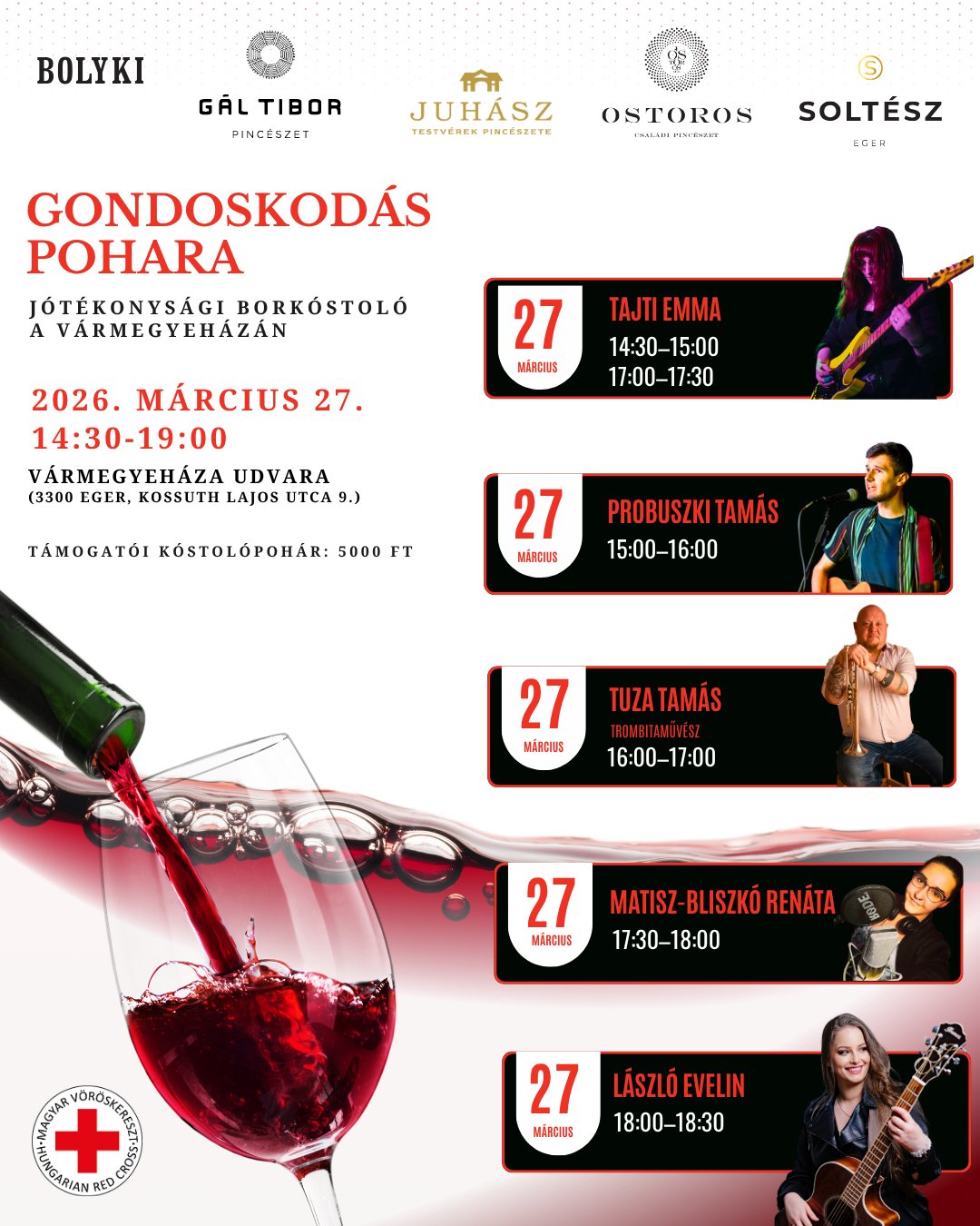 Idén 145 éves a Magyar Vöröskereszt. A jubileum alkalmából a Magyar Vöröskereszt Heves Vármegyei Szervezete a vármegye borászainak közreműködésével, valamint a Heves Vármegyei Önkormányzat és a Heves Vármegyei Kormányhivatal támogatásával jótékonysági borkóstolóra hívja az érdeklődőket.