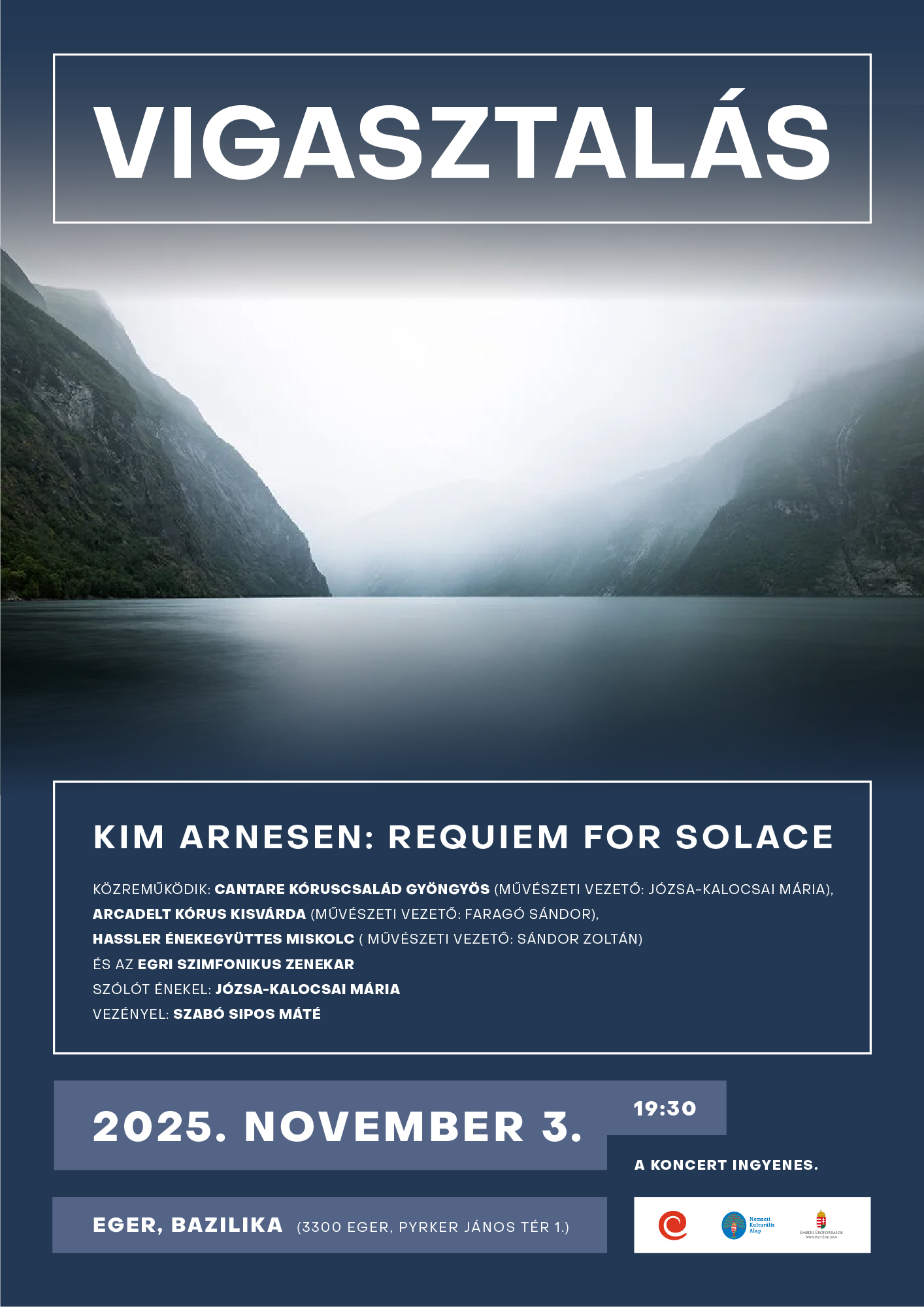 Kim André Arnesen norvég zeneszerző Requiem for Solace című művét a négy zenei együttes összefogásával szólaltatjuk meg székhelyeinken: Gyöngyösön, Egerben, Kisvárdán és Miskolcon. A kórusműveiről híres közkedvelt kortárs, norvég zeneszerző halotti miséjében a hagyományos Requiem szövegét Emily Dickinson verseivel, és egy ismeretlen angol szerző költeményével ötvözi egy mélyen megindító, ötvenperces kompozícióban. A zeneszerző szavai szerint a mű célja, hogy „vigaszt nyújtson a fájdalomban és gyászban szenvedőknek, vagy vigaszt nyújtson az emlékezés és a tiszteletadás pillanataiban”.