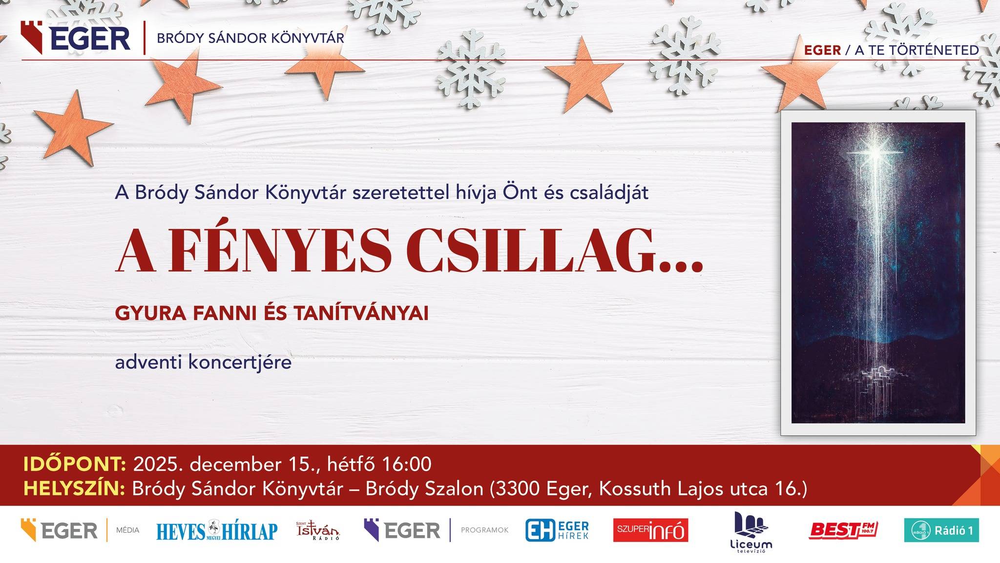 Az Egri Farkas Ferenc Zeneiskolában közel 30 éve működik népzene tanszak, amely számos kiváló énekest és muzsikust adott a magyar zenei palettának. Gyura Fanni egy évtizede tanít a művészeti iskolában, neve az egriek körében ismerősen cseng, hiszen tanítványaival gyakori szereplői a város kulturális programjainak. A népi énekes növendékek, a mai koncerten a magyar néphagyomány karácsonyi ünnepköréből merített szokásdalokat, kántáló és köszöntő énekeket adnak elő, „A fényes csillag” címmel. Az őszinte, tiszta forrásból származó dallamok talán segítenek a mai rohanó világban elcsendesedni, megérkezni és átadni az advent örökérvényű üzenetét.