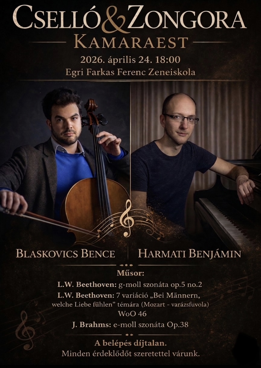 Blaskovics Bence (cselló) és Harmati Benjámin (zongora) koncertje. A belépés díjtalan! A változás joga fenntartva.