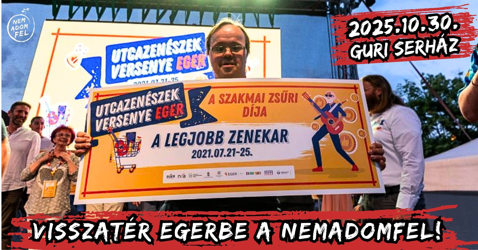 Nem maradnak egri barátaink/rajongóink NEMADOMFEL koncert nélkül! A GURI SERHÁZ befogadott bennünket, s mi örömmel adunk másfél órás "utcakoncertet" a Serház legszebb termében 2025. október 30-án.