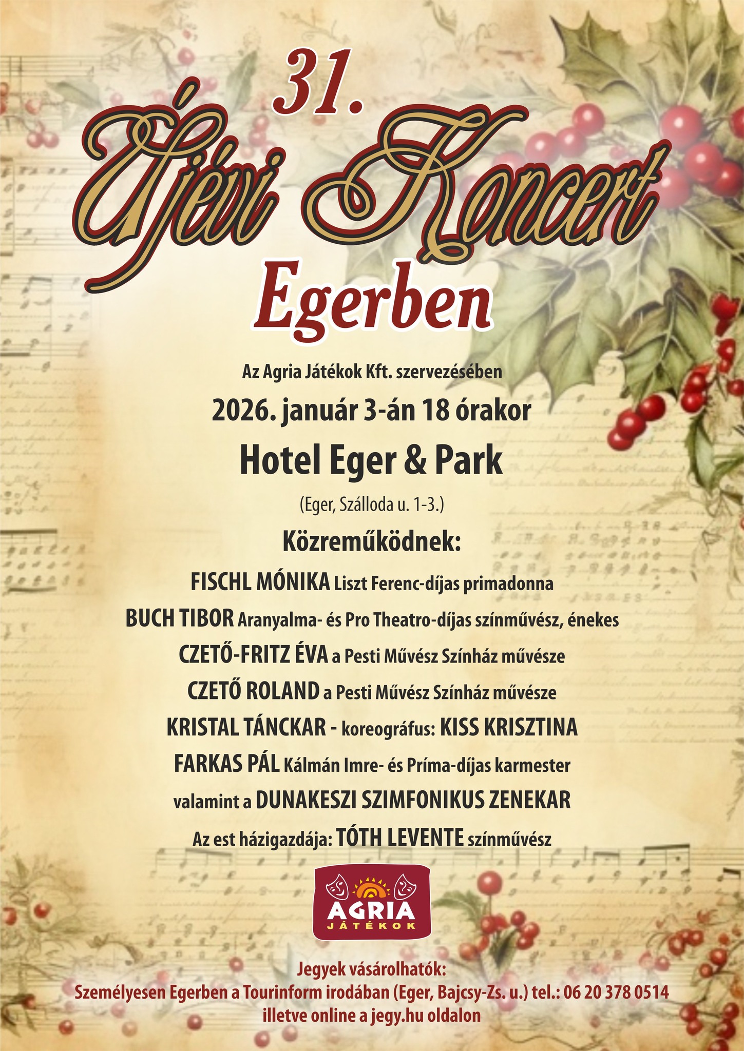 2026. január 3-án ismét megrendezésre kerül az Agria Játékok Kft. szervezésében az ÚJÉVI KONCERT a Hotel Eger & Park dísztermében.