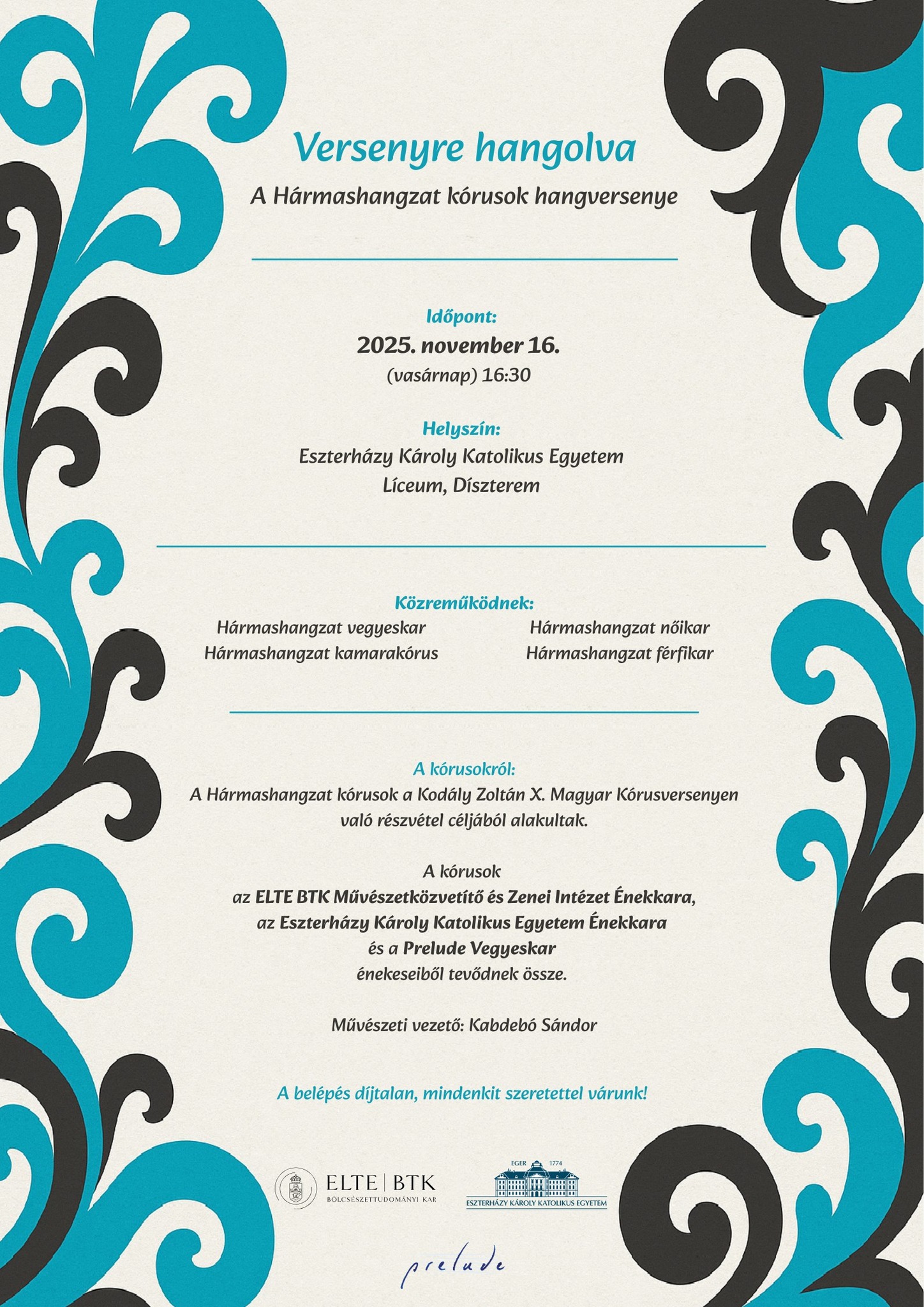 - az ELTE BTK Művészetközvetítő és Zenei Intézet Énekkara, az Eszterházy Károly Katolikus Egyetem Énekkara és a Prelude Vegyeskar énekeseiből tevődnek össze.